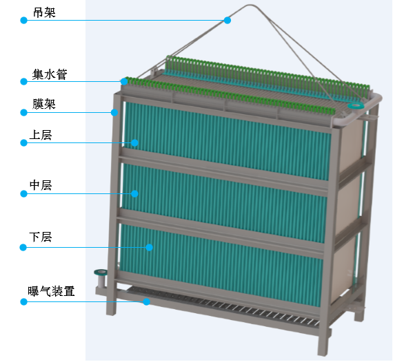 (3)獨特的片狀結(jié)構(gòu),保證上下氣通道順暢,無毛發(fā)纖維纏繞問題;同時在曝氣 作用下,膜片會產(chǎn)生高頻振動,進一步減少污染的堆積;